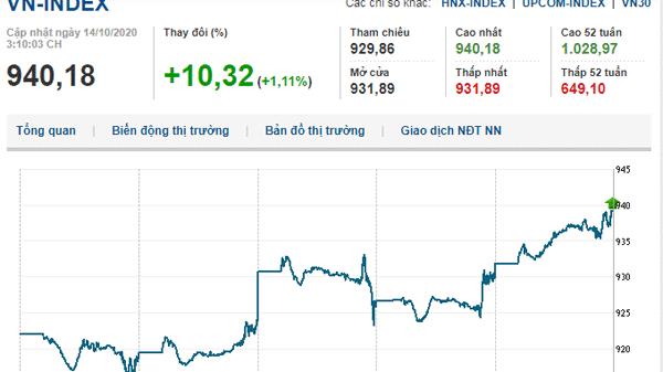 Kết phiên 14/10, VN-Index tăng 10,32 điểm (1,11%) lên 940,18 điểm, HNX-Index tăng 1,34 điểm (0,98%) đạt 137,49 điểm, UPCoM-Index giảm 0,30 điểm (0,47%) xuống 63,13 điểm.