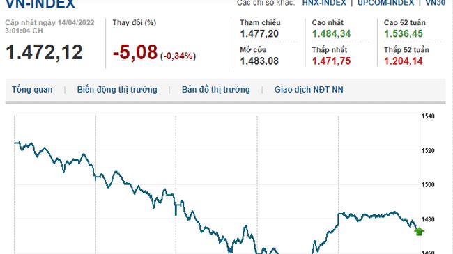 Kết phiên 14/4, VN-Index giảm 5,08 điểm (0,34%) còn 1.472,12 điểm, HNX-Index giảm 3,76 điểm (0,88%) xuống 423,69 điểm, UPCoM-Index tăng 0,11 điểm (0,10%) lên 113,41 điểm.