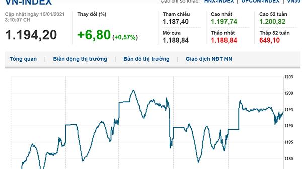 Đóng cửa phiên 15/1, VN-Index tăng 6,80 điểm (0,57%) lên 1.194,20 điểm, HNX-Index tăng 3,20 điểm (1,44%) lên 225,47 điểm, UPCoM-Index tăng 0,88 điểm (1,13%) đạt 78,64 điểm.