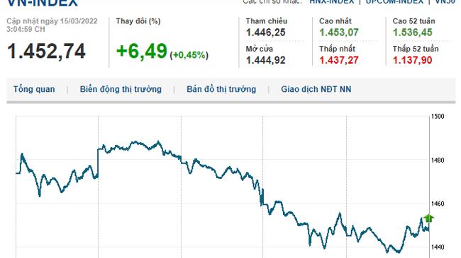 Kết phiên 15/3, VN-Index tăng 6,49 điểm (0,45%) lên 1.452,74 điểm, HNX-Index tăng 6,95 điểm (1,59%) lên 443,52 điểm, UPCoM-Index tăng 0,51 điểm (0,44%) đạt 115,56 điểm.