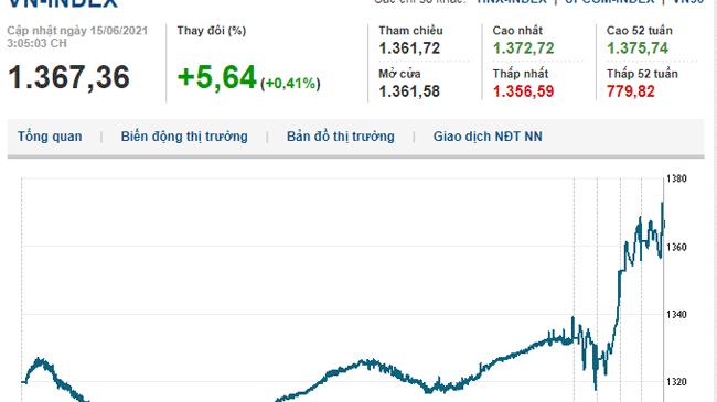 Kết phiên 15/6, VN-Index tăng 5,64 điểm (0,41%) lên 1.367,36 điểm, HNX-Index giảm 0,22% còn 318,29 điểm, UPCoM-Index tăng 0,05% lên 88,87 điểm.