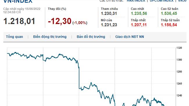 Dừng phiên sáng 15/6, VN-Index giảm 12,3 điểm (1%) về 1.218,01 điểm, HNX-Index giảm 4,26 điểm (1,47%) xuống 285,82 điểm, UPCoM-Index giảm 1,79 điểm (1,98%) còn 88,83 điểm.