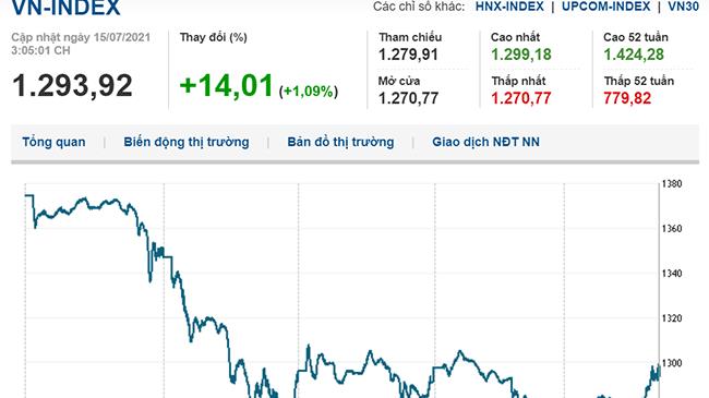 Đóng cửa phiên 15/7, VN-Index tăng 14,01 điểm (1,09%) lên 1.293,92 điểm, HNX-Index tăng 3,18% lên 306,3 điểm, UPCoM-Index tăng 0,49% lên 84,98 điểm.