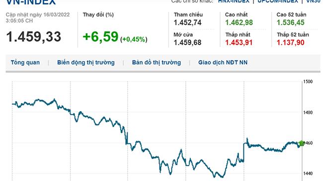 Đóng cửa phiên 16/3, VN-Index tăng 6,59 điểm (0,45%) lên 1.459,33 điểm, HNX-Index tăng 2,66 điểm (0,6%) lên 446,18 điểm, UPCoM-Index tăng 0,48 điểm (0,42%) lên 116,04 điểm.
