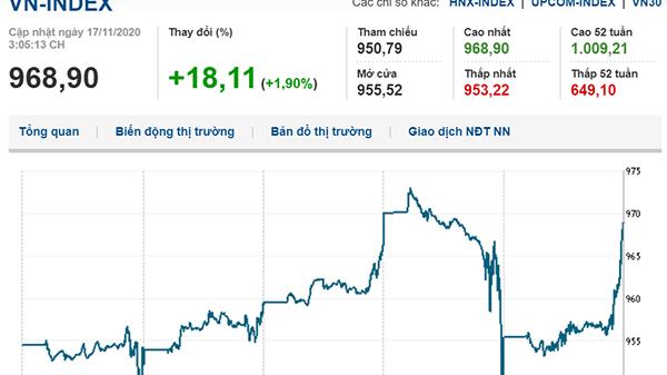 Đóng cửa phiên 17/11, VN-Index tăng 18,11 điểm (1,90%) lên 968,90 điểm, HNX-Index tăng 3,22 điểm (2,25%) lên 146,58 điểm, UPCoM-Index tăng 1,30 điểm (2,00%) đạt 66,15 điểm.