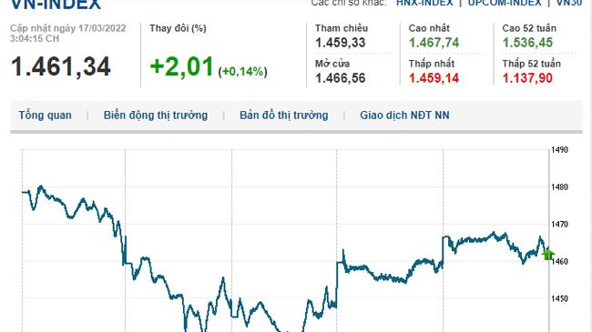 Kết phiên 17/3, VN-Index tăng 2,01 điểm (0,14%) lên 1.461,34 điểm, HNX-Index giảm 0,02 điểm (0,00%) còn 446,16 điểm, UPCoM-Index giảm 0,10 điểm (0,09%) còn 115,94 điểm.