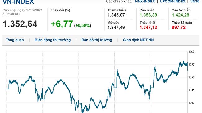 Đóng cửa phiên 17/9, VN-Index 6,77 điểm (0,5%) lên 1.352,64 điểm, HNX-Index tăng 4,73 điểm (1,34%) lên 357,97 điểm, UPCoM-Index tăng 1,16 điểm (1,2%) lên97,4 điểm.