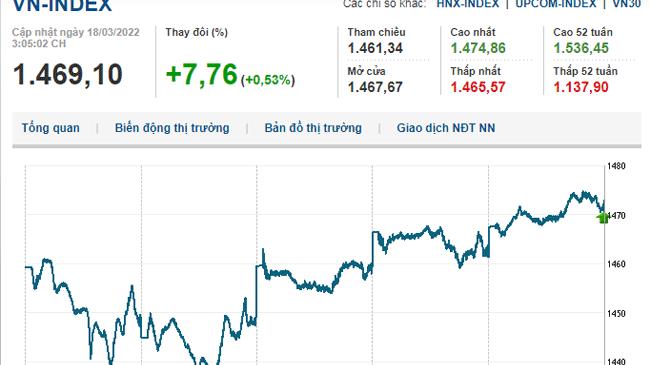 Kết phiên 18/3, VN-Index tăng 7,76 điểm (0,53%) lên 1.469,1 điểm, HNX-Index tăng 5,05 điểm (1,13%) đạt 451,21 điểm, UPCoM-Index tăng 0,1 điểm lên 116,04 điểm.