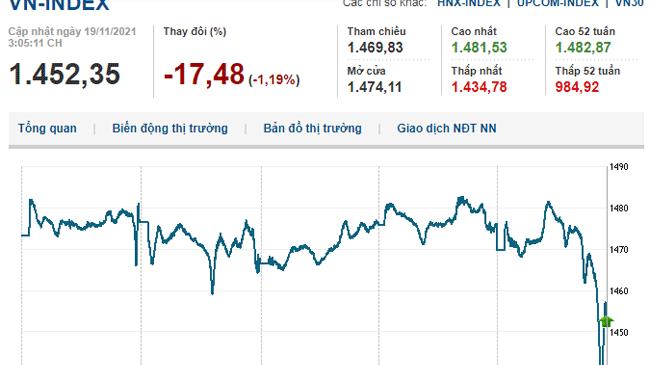 Kết phiên 19/11, VN-Index giảm 17,48 điểm (1,19%) xuống 1.452,35 điểm, HNX-Index giảm 14,75 điểm (3,15%) còn 453,97 điểm, UPCoM-Index giảm 0,28 điểm (0,25%) còn 113,24 điểm.