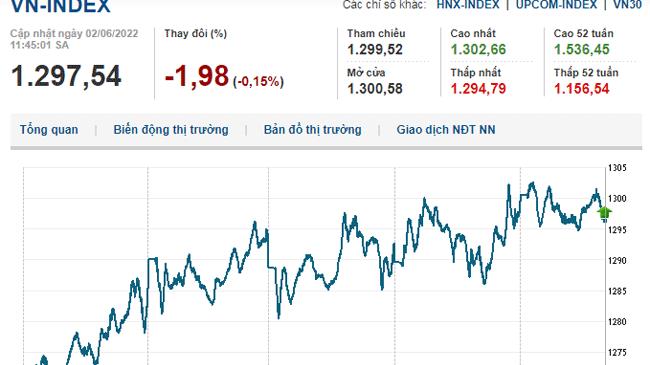 Dừng phiên sáng 2/6, VN-Index giảm 1,98 điểm (0,15%) còn 1.297,54 điểm, HNX-Index giảm 0,57 điểm (0,18%) xuống 314,80 điểm, UPCoM-Index giảm 0,41 điểm (0,43%) còn 94,69 điểm.