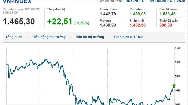 Kết phiên 20/1, VN-Index tăng 22,51 điểm (1,56%) lên 1465,3 điểm, HNX-Index tăng 2,49 điểm (0,61%) lên 411,8 điểm và UPCoM-Index tăng 1,83 điểm (1,7%) lên 109,67 điểm.
