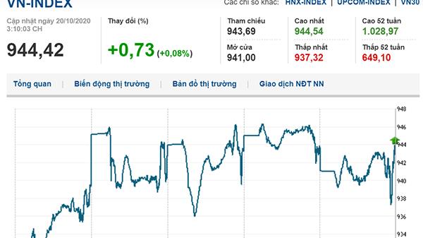 Đóng cửa phiên 20/10, VN-Index tăng 0,73 điểm (0,08%) lên 944,42 điểm; HNX-Index giảm 0,56 điểm (0,40%) còn 140,33 điểm; UPCoM-Index giảm 0,24 điểm (0,37%) còn 63,71 điểm.