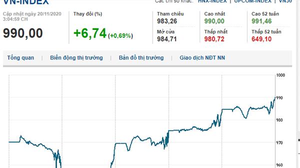 Kết phiên 20/11, VN-Index tăng 6,74 điểm (0,69%) lên 990,00 điểm, HNX-Index tăng 0,36 điểm (0,25%) đạt 147,21 điểm, UPCoM-Index tăng 0,38 điểm (0,58%) đạt 66,43 điểm.