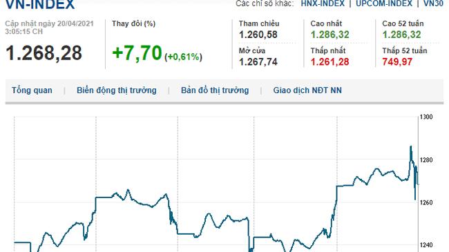 Kết phiên 20/4, VN-Index tăng 7,7 điểm (0,61%) lên 1.268,28 điểm; HNX-Index tăng 0,22% lên 296,4 điểm; UPCoM-Index giảm 0,38% xuống 81,68 điểm.