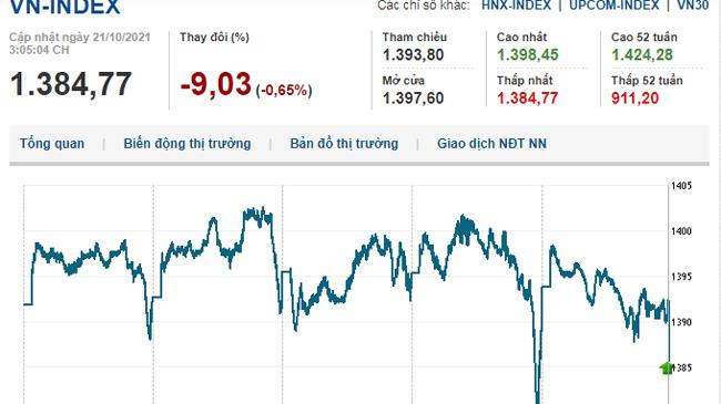 Kết phiên 21/10, VN-Index giảm 9,03 điểm (0,65%) còn 1.384,77 điểm, HNX-Index tăng 0,16 điểm (0,04%) lên 388,45 điểm, UPCoM-Index tăng 0,09% lên 99,77 điểm.