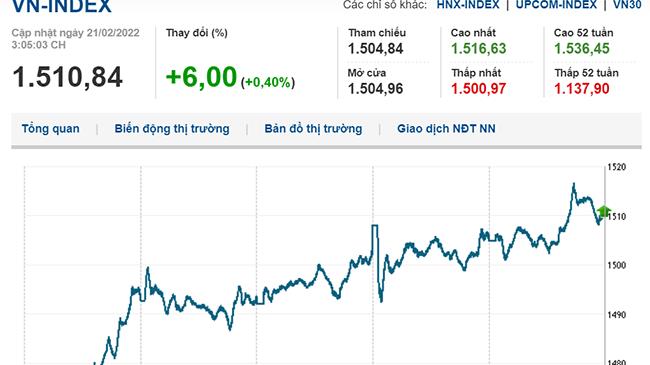 Đóng cửa phiên 21/2, VN-Index tăng 6 điểm (0,4%) lên 1.510,84 điểm, HNX-Index tăng 5,38 điểm (1,24%) đạt 440,99 điểm, UPCoM-Index tăng 0,95 điểm (0,84%0 lên 113,67 điểm.