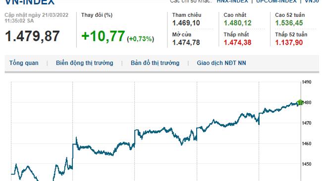 Dừng phiên sáng 21/3, VN-Index tăng 10,77 điểm (0,73%) lên 1.479,87 điểm, HNX-Index tăng 4,64 điểm (1,03%) lên 455,85 điểm, UPCoM-Index giảm 0,35 điểm (0,30%) đạt 115,69 điểm.