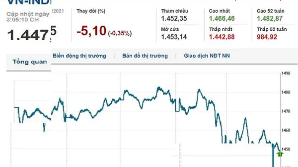 Kết phiên 22/11, VN-Index giảm 5,1 điểm (0,35%) còn 1.447,25 điểm, HNX-Index giảm 9,35 điểm (2,06%) còn 444,62 điểm, UPCoM-Index giảm 1,28 điểm (1,13%) về 111,96 điểm.