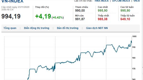Kết phiên 23/11, VN-Index tăng 4,19 điểm (0,42%) lên 994,19 điểm, HNX-Index tăng 0,96 điểm (0,65%) đạt 148,18 điểm, UPCoM-Index tăng 0,26 điểm (0,39%) đạt 66,69 điểm.