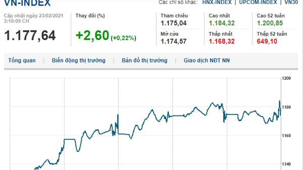 Kết phiên 23/2, VN-Index tăng 2,60 điểm (0,22%) lên 1.177,64 điểm, HNX-Index tăng 0,81 điểm (0,34%) lên 238,78 điểm, UPCoM-Index giảm 0,10 điểm (0,13%) còn 76,47 điểm.