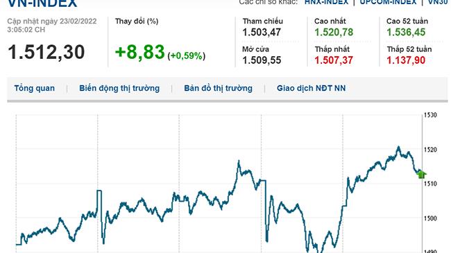 Đóng cửa phiên 23/2, VN-Index tăng 8,83 điểm (0,59%) lên 1.512,3 điểm, HNX-Index tăng 8,11 điểm (1,87%) đạt 442,54 điểm, UPCoM-Index tăng 0,5 điểm (0,44%) lên 113,51 điểm.
