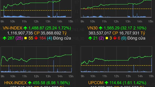 Kết phiên 24/11, VN-Index tăng 25,24 điểm (1,72%) lên 1.488,87 điểm, HNX-Index tăng 6,98 điểm (1,56%) lên 455,58 điểm, UPCoM-Index tăng 1,62 điểm (1,43%) lên 114,64 điểm.