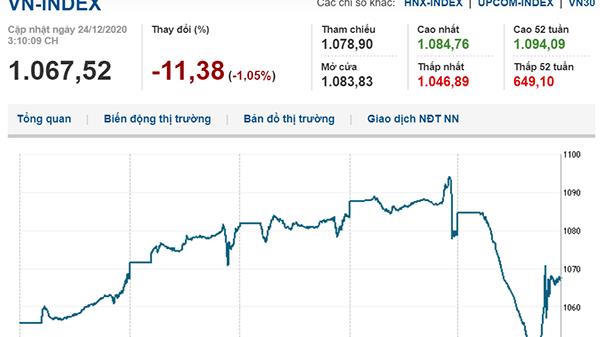 Đóng cửa phiên 24/12, VN-Index giảm 11,38 điểm (1,05%) còn 1.067,52 điểm, HNX-Index giảm 2,62 điểm (1,38%) xuống 187,63 điểm, UPCoM-Index giảm 0,52 điểm (0,71%) còn 73,07 điểm.