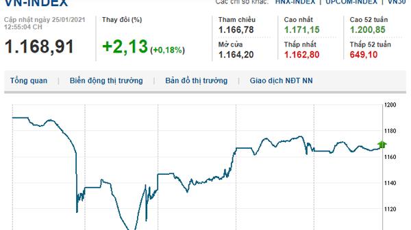 Dừng phiên sáng 25/1, VN-Index tăng 2,13 điểm (0,18%) lên 1.168,91 điểm, HNX-Index giảm 3,04 điểm (1,27%) xuống 237,07 điểm, UPCoM-Index giảm 0,15 điểm (0,19%) còn 77,45 điểm.