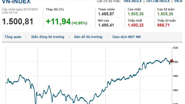 Kết phiên 25/11, VN-Index tăng 11,94 điểm (0,8%) lên 1.500,81 điểm, HNX-Index tăng 4,09 điểm (0,9%) đạt 459,67 điểm, UPCoM-Index giảm 0,16 điểm (0,14%) còn 114,49 điểm.
