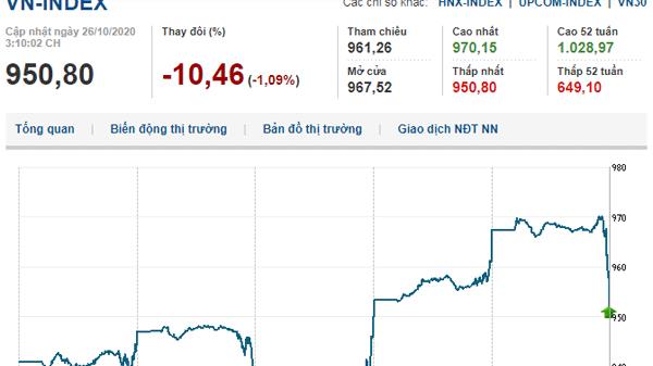 Kết phiên 26/10, VN-Index giảm 6,3 điểm (0,66%) còn 967,56 điểm, HNX-Index giảm 1,88% còn 139,03 điểm, UPCoM-Index giảm 0,53% còn 63,57 điểm.