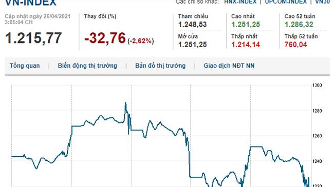 Kết phiên 26/4, VN-Index giảm 32,76 điểm (2,62%) xuống 1.215,77 điểm, HNX-Index giảm 1,04% xuống 280,68 điểm, UPCoM-Index giảm 1,22% xuống 79,42 điểm.