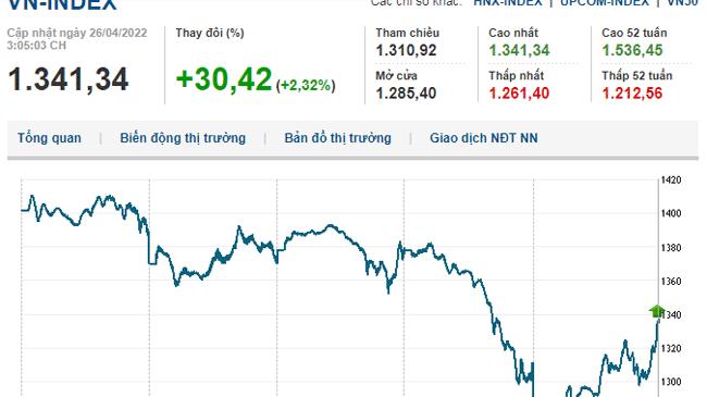 Kết phiên 26/4, VN-Index tăng 30,42 điểm (2,32%) lên 1.341,34 điểm, HNX-Index tăng 7,66 điểm (2,27%) đạt 345,17 điểm, UPCoM-Index tăng 1,61 điểm (1,62%) lên 101,55 điểm.