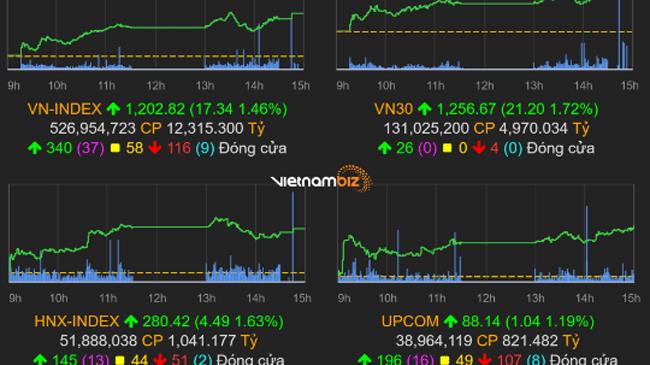 VN-Index đóng cửa cao nhất phiên, dừng chân ở mốc 1.202,82 điểm, tăng hơn 17 điểm so với phiên trước đó.