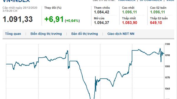 Kết phiên 28/12, VN-Index tăng 6,91 điểm (0,64%) lên 1.091,33 điểm, HNX-Index tăng 4,12 điểm (2,14%) đạt 196,57 điểm, UPCoM-Index tăng 0,16 điểm (0,22%) đạt 73,10 điểm.
