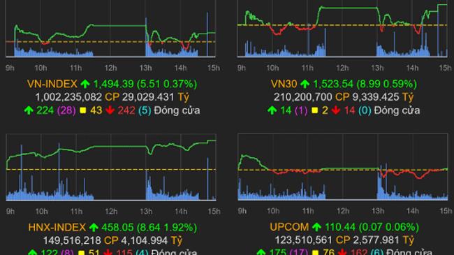 Kết phiên 28/12, VN-Index tăng 5,51 điểm (0,37%) lên 1.494,39 điểm, HNX-Index tăng 8,64 điểm (1,92%) đạt 458,05 điểm, UPCoM-Index tăng 0,07 điểm (0,07%) lên 110,44 điểm.