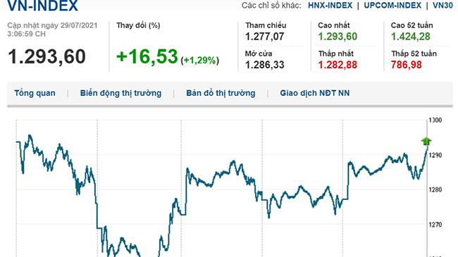 Đóng cửa phiên 29/7, VN-Index tăng 16,53 điểm (1,29%) lên 1.293,6 điểm, HNX-Index tăng 1,54% lên 310,97 điểm, UPCoM-Index tăng 1,39% lên 86,14 điểm.