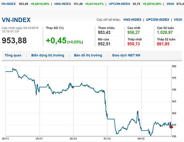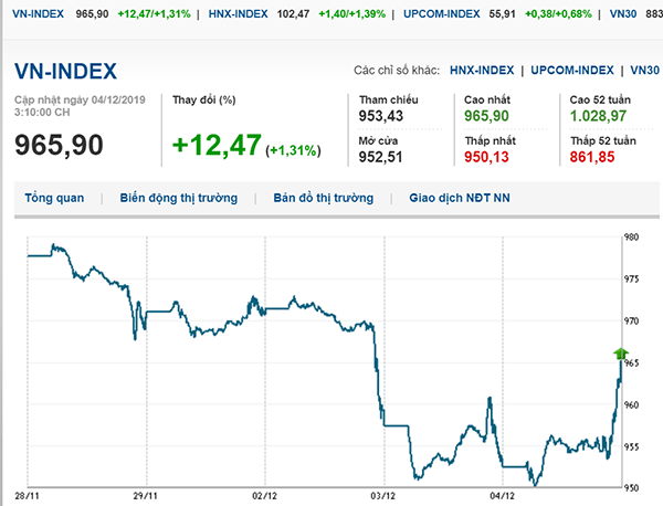 Đóng cửa phiên 4/12, VN-Index tăng 12,47 điểm (1,31%) lên 965,90 điểm; HNX-Index tăng 1,40 điểm (1,39%) lên 102,47 điểm; UPCom-Index tăng 0,38 điểm (0,68%) lên 55,91 điểm.
