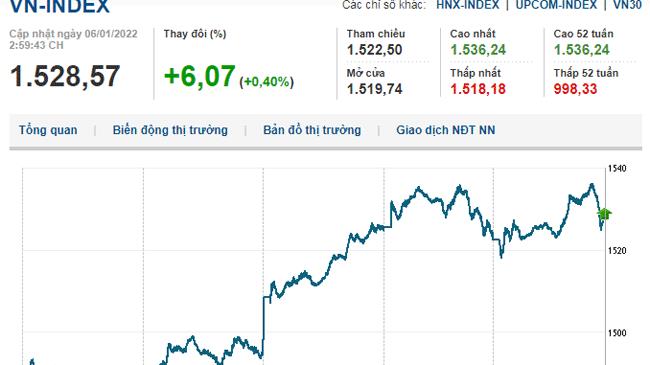 Kết phiên 6/1, VN-Index tăng 6,07 điểm (0,4%) lên 1.528,57 điểm, HNX-Index tăng 4,53 điểm (0,94%) đạt 484,89 điểm, UPCoM-Index tăng 0,13 điểm (0,11%) lên 114,39 điểm.