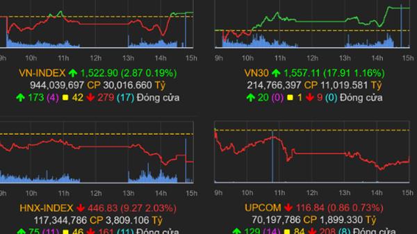 Kết phiên 6/4, VN-Index tăng 2,87 điểm (0,19%) lên 1.522,9 điểm, HNX-Index giảm 9,27 điểm (2,03%) còn 446,83 điểm, UPCoM-Index giảm 0,86 điểm (0,73%) xuống 116,84 điểm.