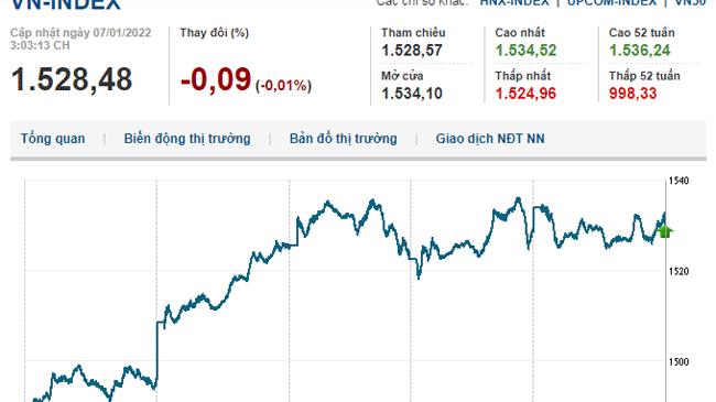 Kết phiên 7/1, VN-Index giảm 0,09 điểm (0,01%) còn 1.528,48 điểm, HNX-Index tăng 8,95 điểm (1,85%) đạt 493,84 điểm, UPCoM-Index tăng 1,21 điểm (1,06%) lên 115,60 điểm.