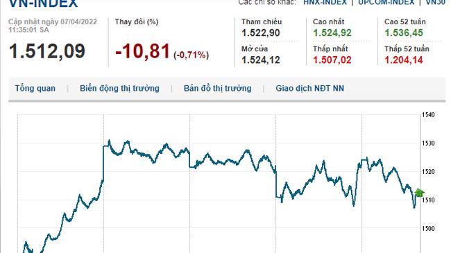 Dừng phiên sáng 7/4, VN-Index giảm 10,81 điểm (0,71%) xuống 1.512,09 điểm, HNX-Index giảm 2,77 điểm (0,62%) còn 444,06 điểm, UPCoM-Index giảm 1,10 điểm (0,94%) xuống 115,74 điểm.