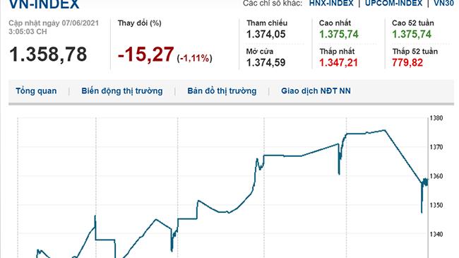 Đóng cửa phiên 7/6, VN-Index giảm 15,27 điểm (1,11%) xuống 1.358,78 điểm, HNX-Index giảm 11,13 điểm (3,38%) còn 318,63 điểm, UPCoM-Index giảm 1,53 (1,69%) còn 89,06 điểm.