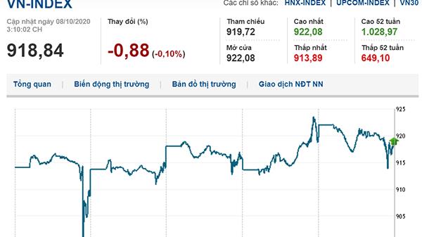 Đóng cửa phiên 8/10, VN-Index giảm 0,88 điểm (0,10%) xuống 918,84 điểm; HNX-Index giảm 0,52 điểm (0,38%) còn 135,61 điểm; UPCoM-Index giảm 0,42 điểm (0,66%) còn 63,53 điểm.