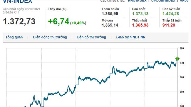 Kết phiên 8/10, VN-Index tăng 6,74 điểm (0,49%) lên 1.372,73 điểm, HNX-Index tăng 1,52 điểm (0,41%) lên 371,92 điểm, UPCoM-Index tăng 0,34 điểm (0,34%0 lên 98,3 điểm.