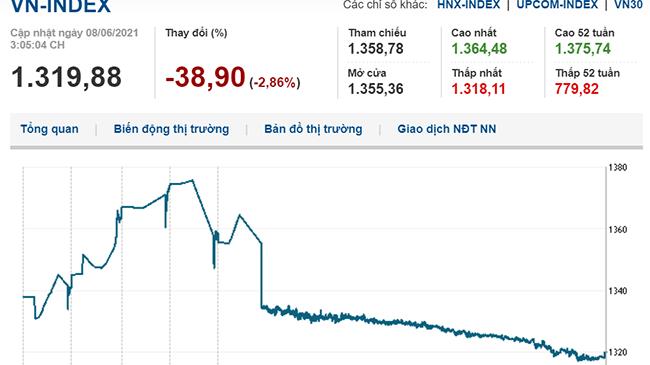 Đóng cửa phiên 8/6, VN-Index giảm 38,90 điểm (2,86%) xuống 1.319,88 điểm, HNX-Index giảm 12,25 điểm (3,84%) còn 306,39 điểm, UPCoM-Index giảm 2,67 (3,00%) còn 86,40 điểm.