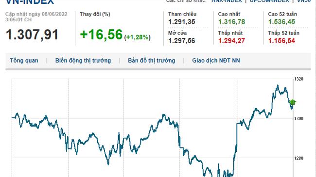 * Phiên giao dịch chiều 8/6/2022: VN-Index tăng gần 17 điểm