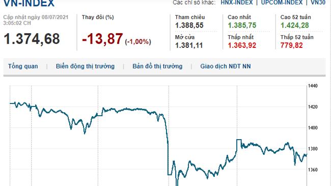 Kết phiên 8/7, VN-Index giảm 13,87 điểm (1%) xuống 1.374,68 điểm, HNX-Index giảm 1,2% về 315,98 điểm, UPCoM-Index giảm 0,73% còn 88,49 điểm.