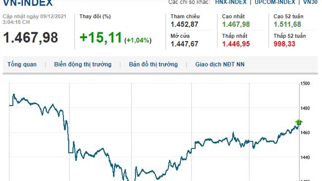 Kết phiên 9/12, VN-Index tăng 15,11 điểm (1,04%) lên 1.467,98 điểm, HNX-Index tăng 2,79 điểm (0,62%) đạt 452,53 điểm, UPCoM-Index tăng 0,62 điểm (0,56%) lên 111,91 điểm.
