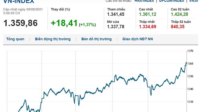 Đóng cửa phiên 9/8, VN-Index tăng 18,41 điểm (1,37%) lên 1.359,86 điểm, HNX-Index tăng 5,22 điểm (1,6%) lên 330,68 điểm, UPCoM-Index tăng 1,1 điểm (1,25%) lên 89,38 điểm.