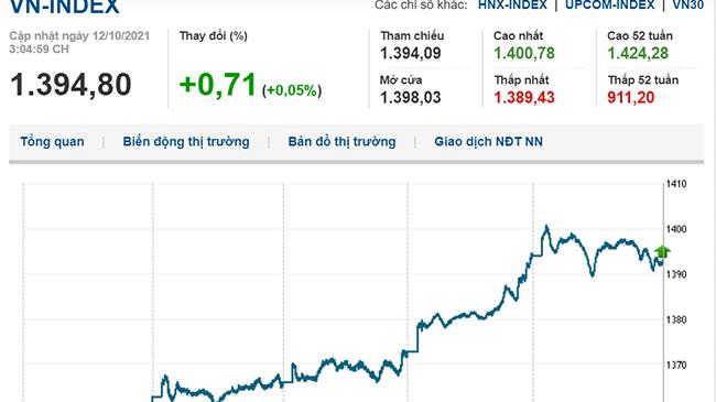 Đóng cửa phiên 12/10, VN-Index tăng 0,71 điểm (0,05%) lên 1.394,8 điểm, HNX-Index tăng 1,34 điểm (0,36%) lên 375,68 điểm, UPCoM-Index tăng 0,01 điểm (0,01%) lên 98,81 điểm.